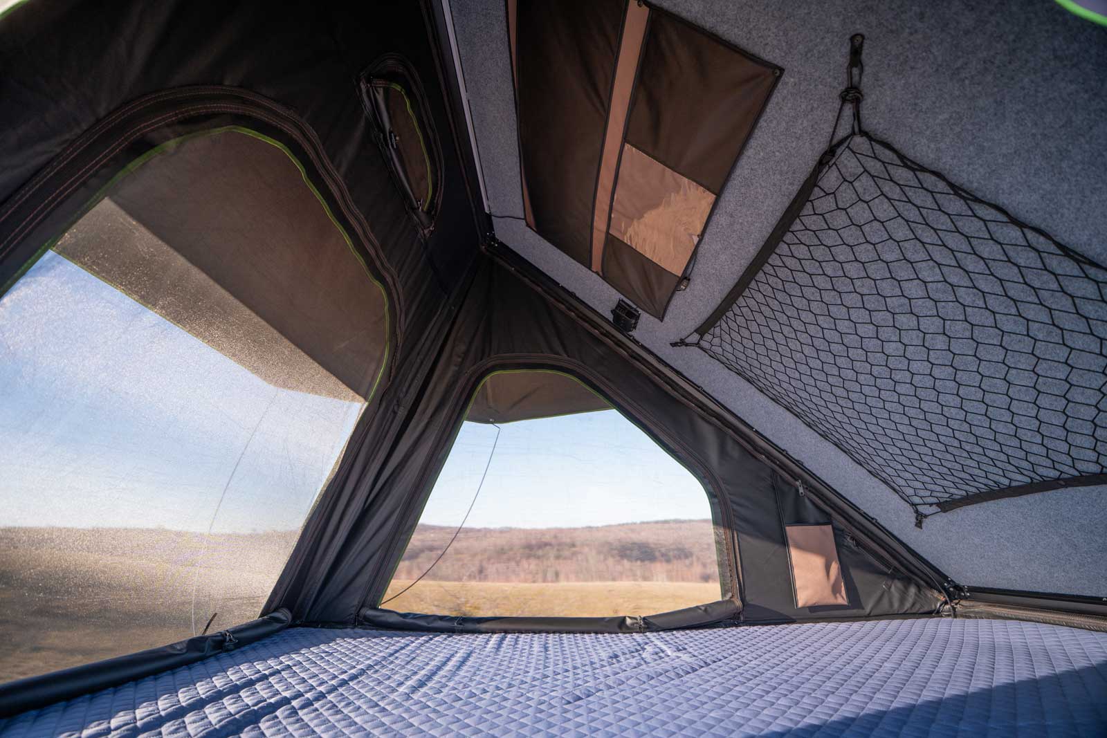 Dentro de la tienda de techo, la gruesa moqueta de grado marino en el suelo y el techo mejora el aislamiento térmico y acústico, al tiempo que previene la condensación. La moqueta también ofrece la posibilidad de añadir otros accesorios y artículos mediante correas de velcro.
