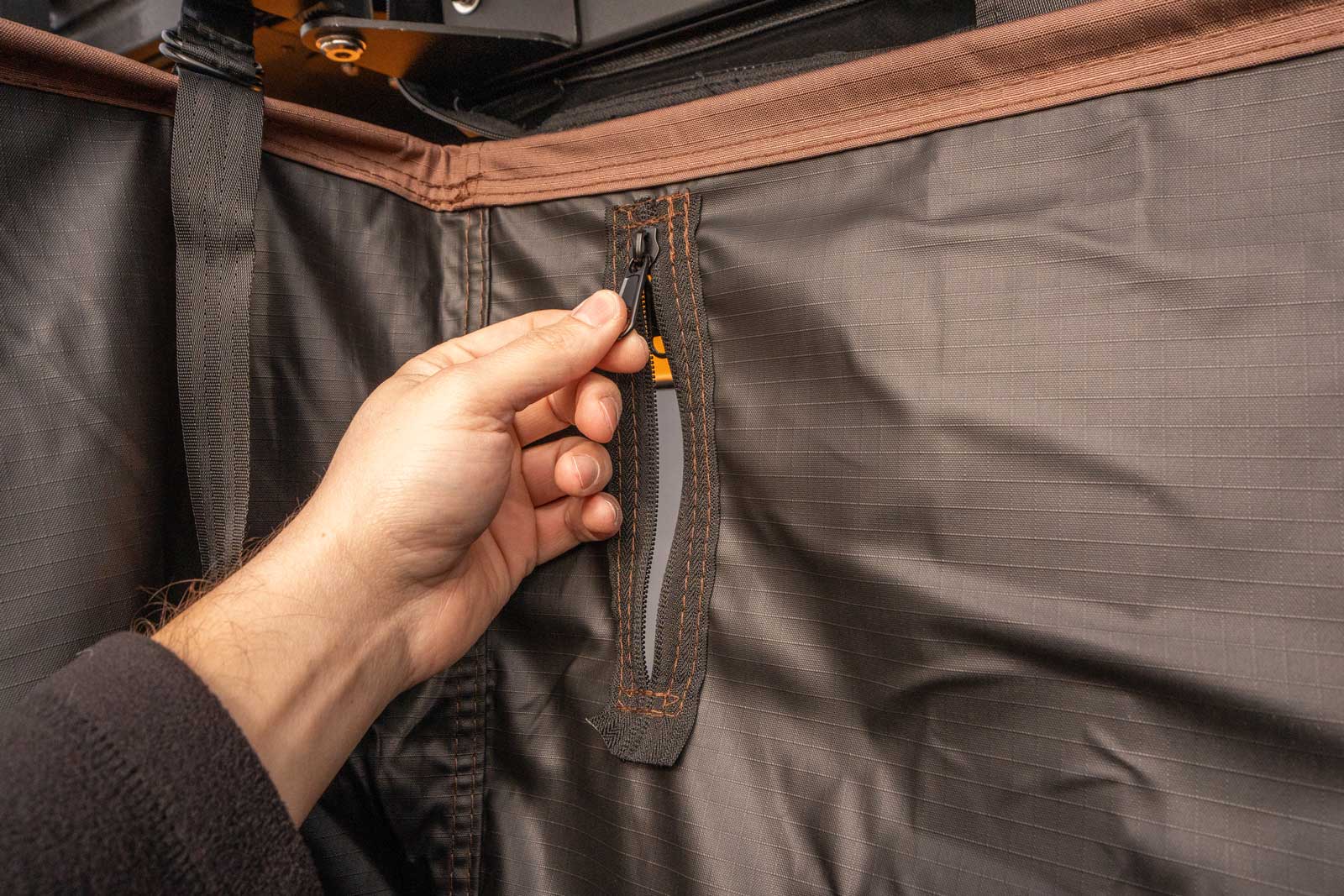 Two well-placed interior pockets provide easy access to essentials, whether you’re showering, changing, or using the space for a private moment. The back opening is another clever design touch, allowing you to access your car directly from inside the awning - perfect for grabbing items or adjusting the space without stepping outside. Also using the small hatch on the top back side is the perfect way to route your shower head inside.