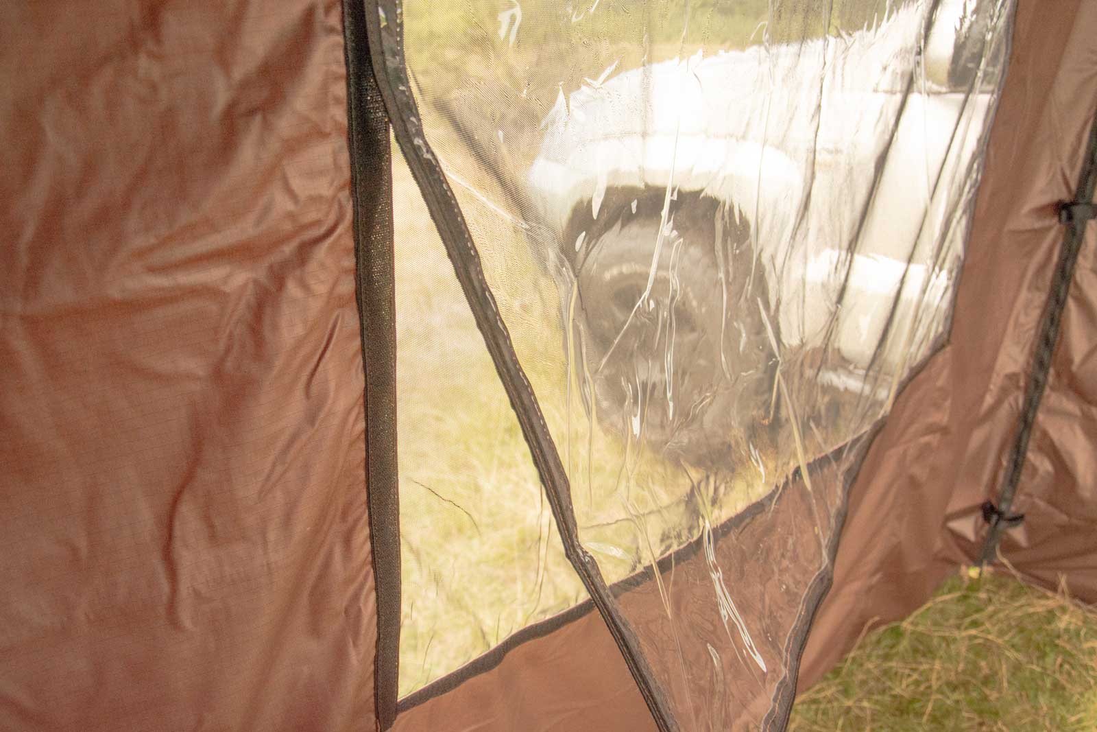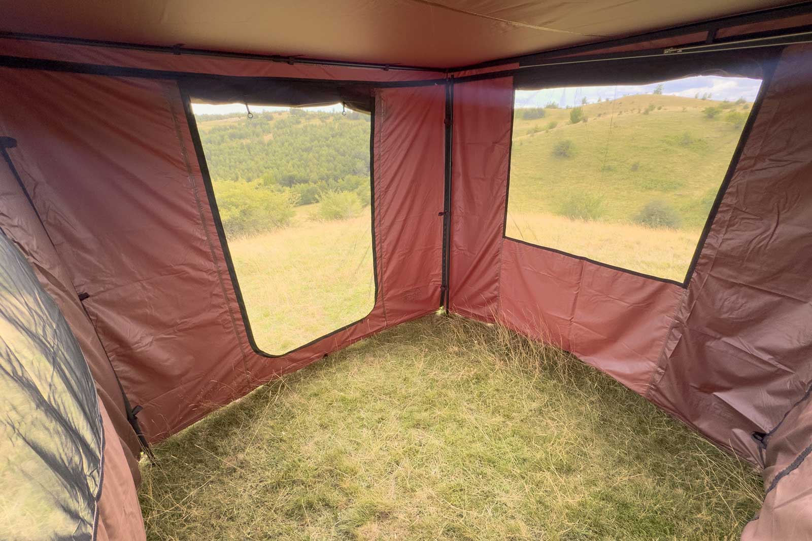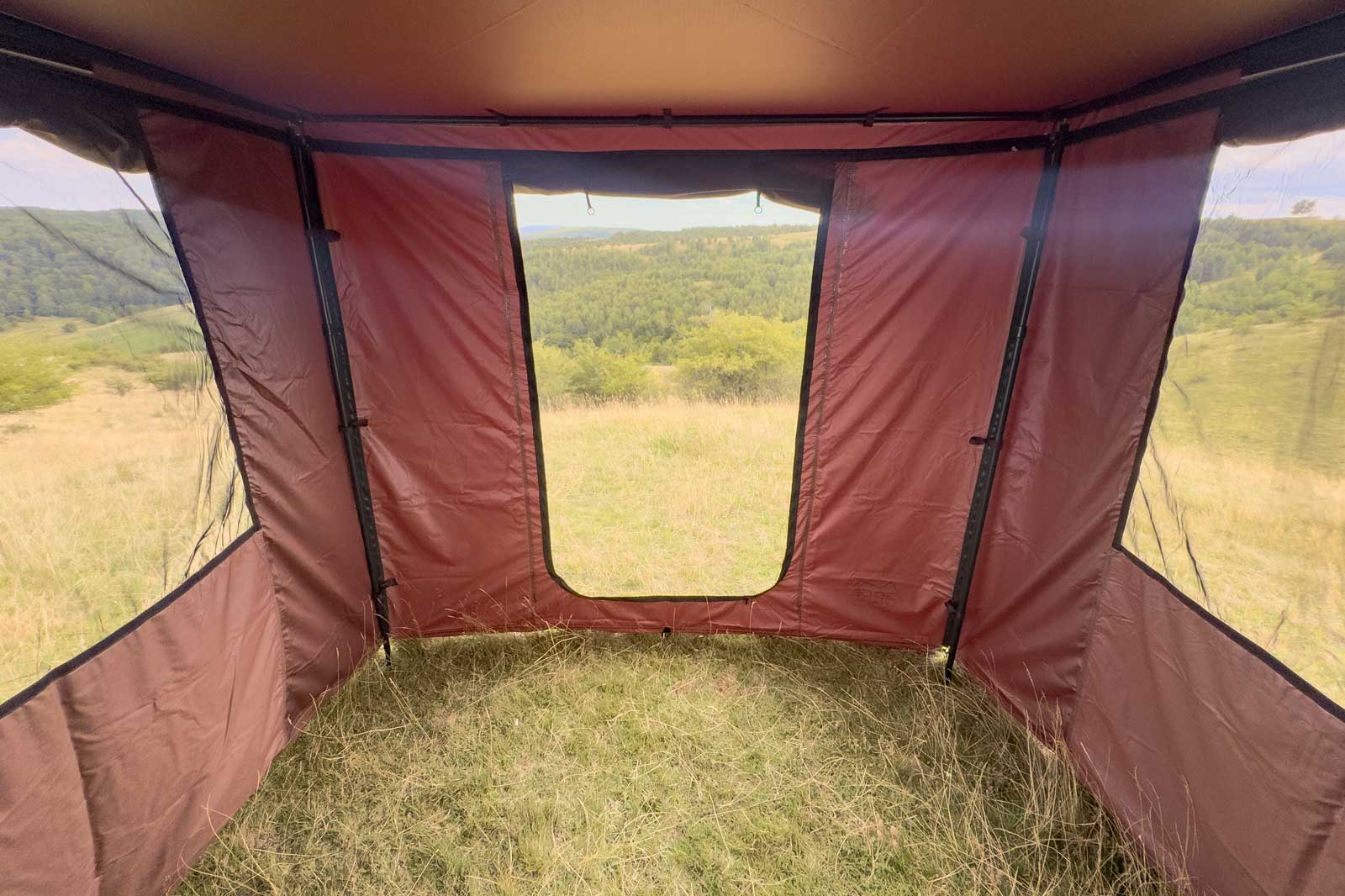 În interior, ferestrele mari și o ușă pe toată înălțimea cu plase anti-țânțari îți oferă ventilație și lumină naturală fără să lase insectele să intre. Când vremea se schimbă, acoperitoarele transparente din PVC se prind cu velcro peste ferestre, ținând ploaia și vântul afară, dar permițându-ți să vezi afară. Iar dacă ai nevoie de intimitate totală – fie pentru a te schimba, fie doar pentru a avea câteva momente pentru tine - poți închide totul cu fermoarul.