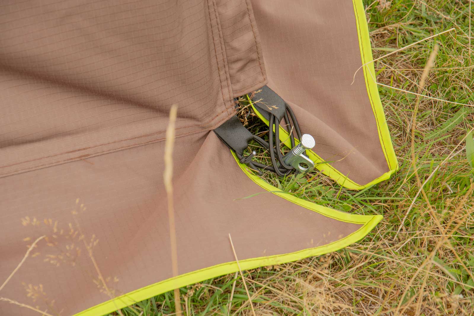 Pentru stabilitate, am adăugat trei puncte de ancorare pentru fiecare perete: unul la fiecare colț și unul la mijloc. Acest lucru menține pânza întinsă și sigură, chiar și când vântul bate puternic. Reglajele elastice previn ruperea sau smulgerea, iar benzile velcro conectează pereții la picioarele marchizei pentru a preveni fluturarea în rafale puternice.
