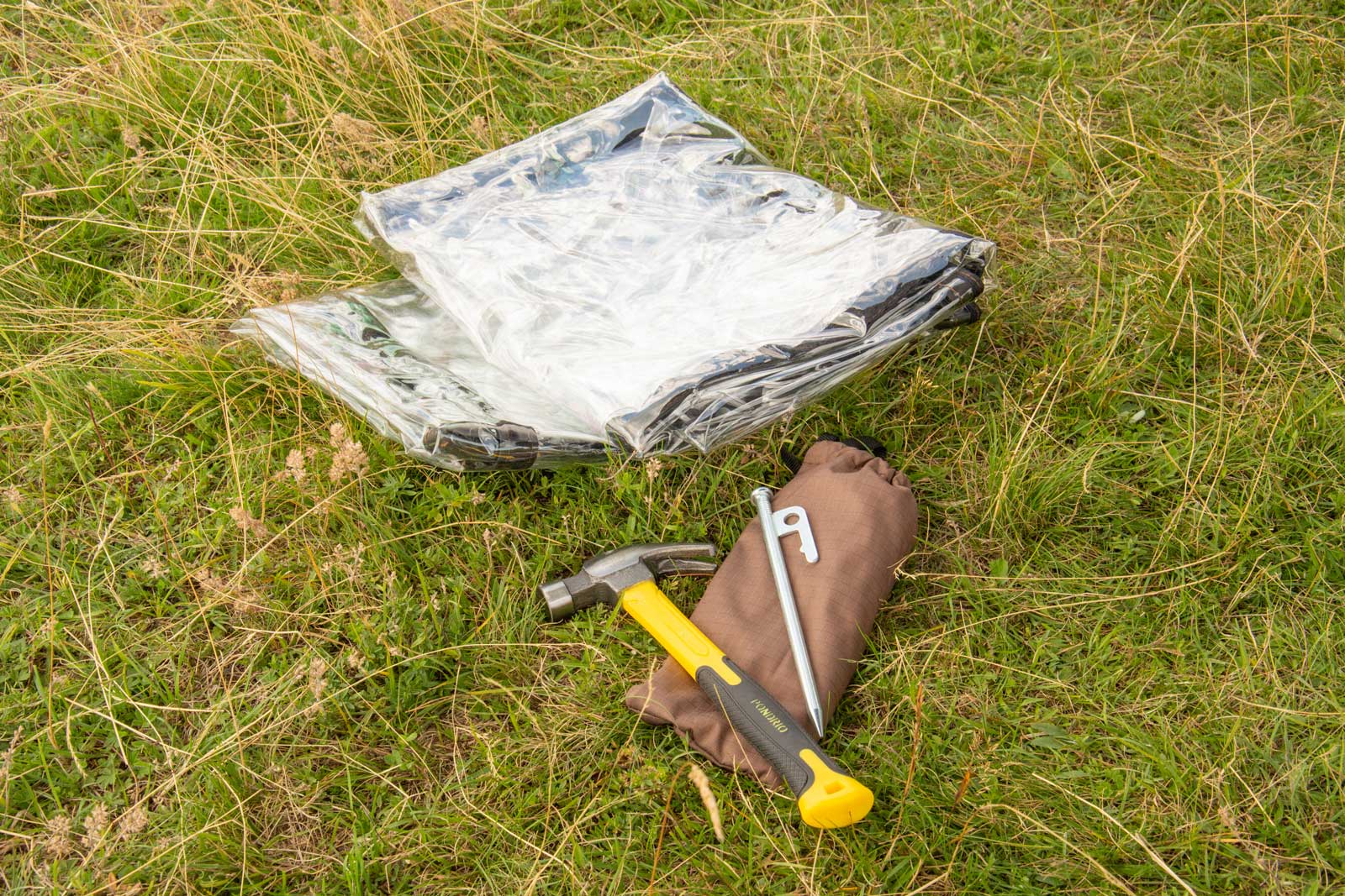 Tot ce ai nevoie este inclus în geantă: țăruși groși din oțel inoxidabil care prind chiar și în sol tare ca piatra, un ciocan pentru a-i fixa și o geantă de transport compactă care îți permite să îl iei cu tine fără să ocupe spațiu valoros în mașină.